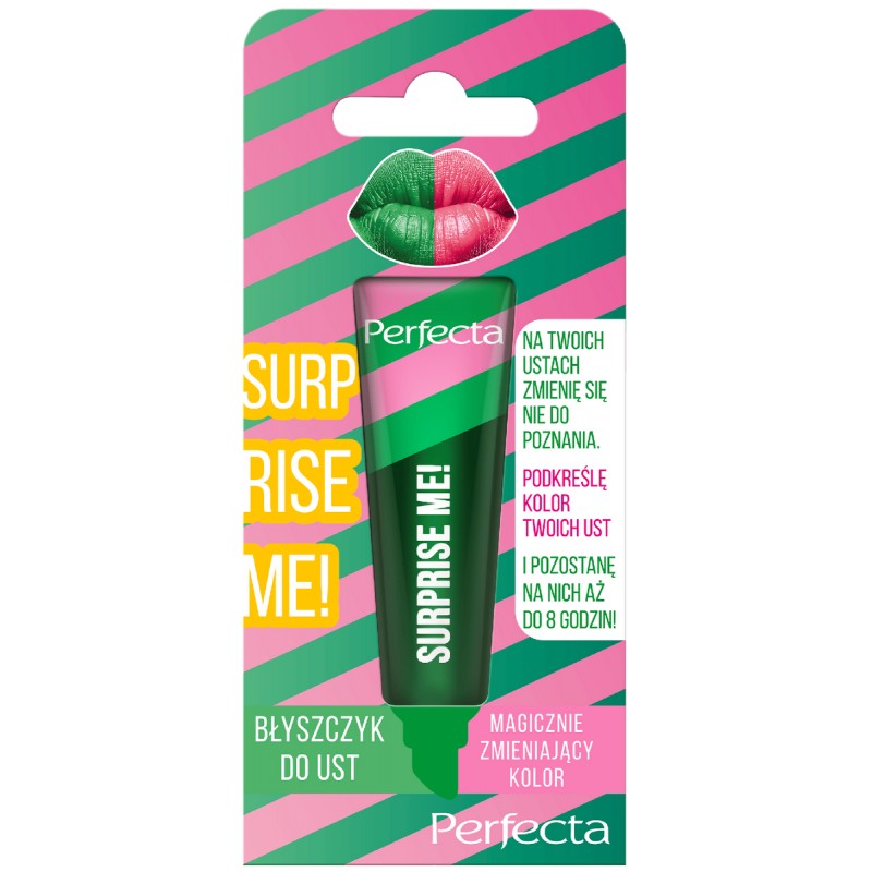 Daj się zaskoczyć błyszczykowi Perfecta SURPRISE ME! Ten magiczny błyszczyk zmieni kolor na Twoich ustach. Jak to możliwe? Formuła SURPRISE ME! zawiera specjalny barwnik, który zmieni się pod wpływem pH skóry. A to nie wszystko. SURPRISE ME! to długotrwały kolor, który pozostanie z Tobą do 8 godzin, delikatny blask i super-nawilżenie dla Twoich ust. Z OLEJEM JOJOBA, KTÓRY NAWILŻA I WYGŁADZA USTA! MEGATRWAŁY KOLOR! NAWET DO 8 GODZIN! BAW SIĘ KOLOREM! BLASK!