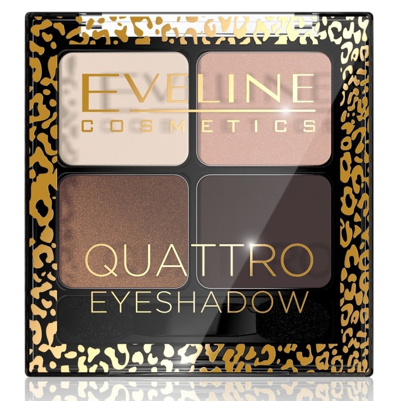 QUATTRO - Professional Eyeshadow Palette marki Eveline Cosmetics. Paleta cieni do powiek. Składa się z 4 dobrze do siebie dobranych kolorystycznie, prasowanych pudrów o różnych wykończeniach. Delikatna, mocno napigmentowana formuła, pozwala na stworzenie wielu niesamowitych makijaży, bez osypywania się i rolowania w załamaniu powieki. Dodatkowo produkt został umieszczony w wygodnej i kompaktowej paletce, która doskonale sprawdzi się w podróży.