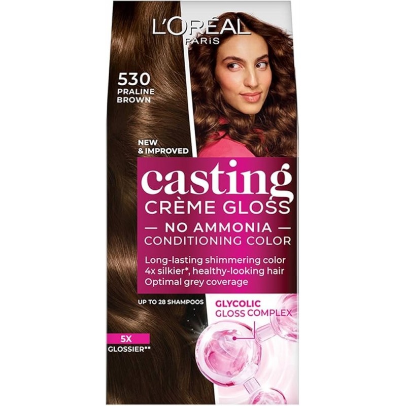 Odkryj nowy Casting Creme Gloss. Szybka i łatwa w użyciu koloryzacja BEZ AMONIAKU zapewniająca wyjątkowo lśniące włosy i optymalne pokrycie siwych włosów. 3X WIĘCEJ BLASKU*, WIDOCZNIE ZDROWSZE WŁOSY I OPTYMALNE POKRYCIE SIWYCH WŁOSÓW. 10% KOMPLEKS GLYCOLIC GLOSS Z KWASEM GLIKOLOWYM. Casting Creme Gloss został wzbogacony o Kwas Glikolowy znany z pielęgnacji skóry na najwyższym poziomie. Jak działa formuła? Intensywnie pielęgnuje i koloryzuje, zapewniając widocznie zdrowsze, bardziej lśniące włosy i optymalne pokrycie siwych włosów. Otula włókna włosów, nadając im długotrwały, lustrzany blask.