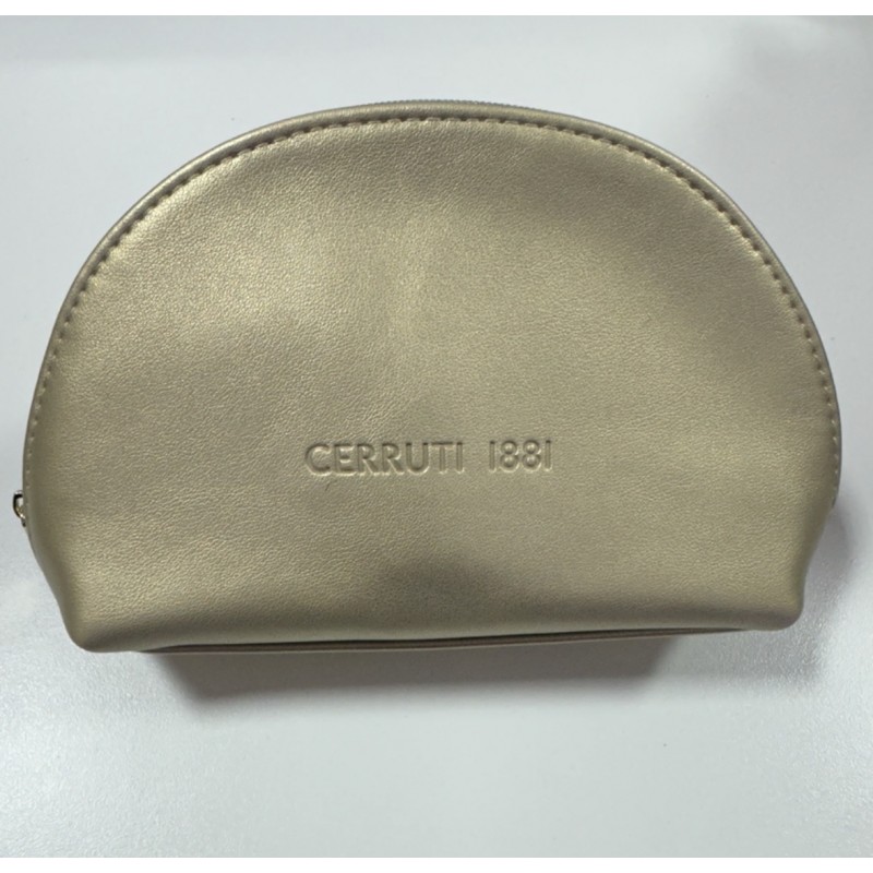 Elegancka kosmetyczka damska . Jednokieszeniowa , wkładana od wewnątrz złotym materiałem , zamek zakończony zawieszka z logo Cerruti .
