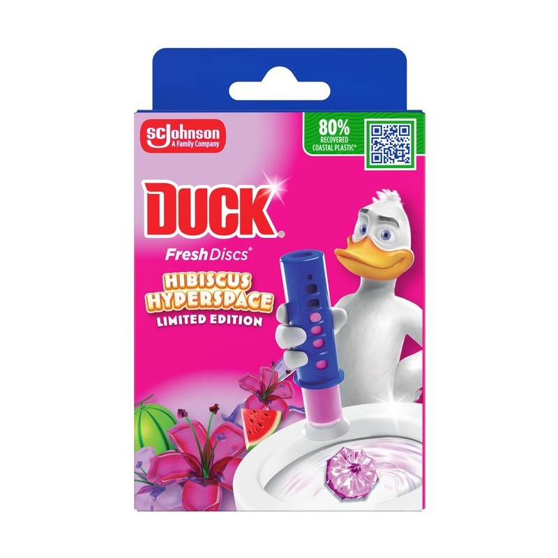 Dodaj swojej toalecie świeżości inspirowanej egzotycznymi nutami. Duck® Fresh Discs® Hibiscus Hyperspace tworzy delikatną warstwę ochronną zapobiegającą osadzaniu się kamienia i brudu. Kwiatowy hibiskus w połączeniu z arbuzem i śliwką wypełnia łazienkę przyjemnym, owocowo‑kwiatowym zapachem. Aplikacja jest szybka, bezdotykowa i pozbawiona plastikowego koszyczka.