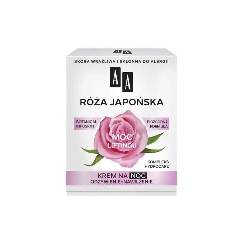 Linia kosmetyków botanicznych – wykorzystujących siłę i bogactwo wyselekcjonowanych substancji roślinnych.Działanie składników aktywnych:Olejek z róży japońskiej, znany także jako olejek tsubaki, zawiera składniki hamujące enzym, odpowiedzialny za rozkład kolagenu w skórze, dzięki czemu staje się ona napięta, ujędrniona oraz widocznie gładsza.Olej z ostropestu, bogaty w sylimarynę, która stymuluje produkcję kolagenu i elastyny, głęboko odżywia i regeneruje skórę, hamując procesy starzenia.Kompleks HydroCare odpowiada za długotrwałe nawilżenie skóry oraz łagodzenie, pozostawiając ją aksamitnie miękką i gładką.Kompleks ceramidowy wzmacnia strukturę skóry i wspomaga jej funkcje barierowe.Efekt: Skóra zostaje wzmocniona i nabiera elastyczności. Zmarszczki są wygładzone, a kontur twarzy poprawiony.Botanical Infusion System, oparty na technologii, opatentowanej przez Oceanic S.A., biomatrycy polilipidowej oraz kompleksie BIHA, zwiększa skuteczność przenikania ekstraktów roślinnych w powierzchniowych warstwach naskórka. Dzięki niemu, starannie wyselekcjonowane, roślinne substancje aktywne, są lepiej przyswajane przez skórę i wykazują z nią biozgodność, pobudzając do regeneracji i wzmacniając działanie pielęgnacyjne kremu. Cera odzyskuje witalność i doskonałe nawilżenie.Dzięki wysokiej biozgodności ze skórą składniki są przez nią dobrze wchłaniane i szybko rozpoznawane – w efekcie idealnie z nią współdziałają.Naturalne mechanizmy regeneracyjne zostają pobudzone, dzięki czemu komórki odzyskują witalność.Składniki antyrodnikowe pomagają chronić skórę przed działaniem szkodliwych czynników zewnętrznych.Naturalny koktajl życia intensywnie odmładza – wygładza skórę i poprawia jej elastyczność.Bezpieczeństwo dla skóry wrażliwej i skłonnej do alergii. Marka AA łączy najwyższe bezpieczeństwo kosmetyków z ich wysoką skutecznością i przyjemną aplikacją.Ponad 35 lat troski o potrzeby skóry wrażliwej.Produkty w 100% przebadane alergologicznie.Technologie strzeżone patentami.Wykorzystanie najnowszych osiągnięć kosmetologii.Współpraca z lekarzami dermatologami i alergologami.Certyfikowane składniki, wyselekcjonowane z myślą o skórze wrażliwej.To dla nas prawdziwe wyróżnienie, kiedy możemy stać się Twoim wyborem – i wspierać Cię w skutecznej i bezpiecznej pielęgnacji.