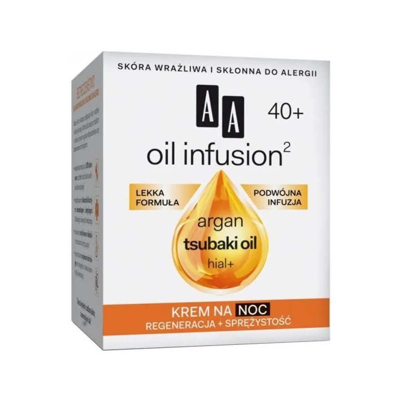 AA Oil Infusion2 40+ to zaawansowany program pielęgnacjiprzeciwzmarszczkowej, oparty na odmładzającym działaniu szlachetnych olejków- tsubakii arganowego oraz kompleksu Hial+.Luksusowe olejki - wysoce biozgodne zeskórą, uzupełniają występujące w niej niedobory substancji budulcowych,jednocześnie pobudzając fibroblastydo produkcji kolagenu. W efekcie skóra przechodzi prawdziwą metamorfozę - zmarszczki ulegają wygładzeniu, następujewyraźna poprawa elastyczności i nawilżenia.