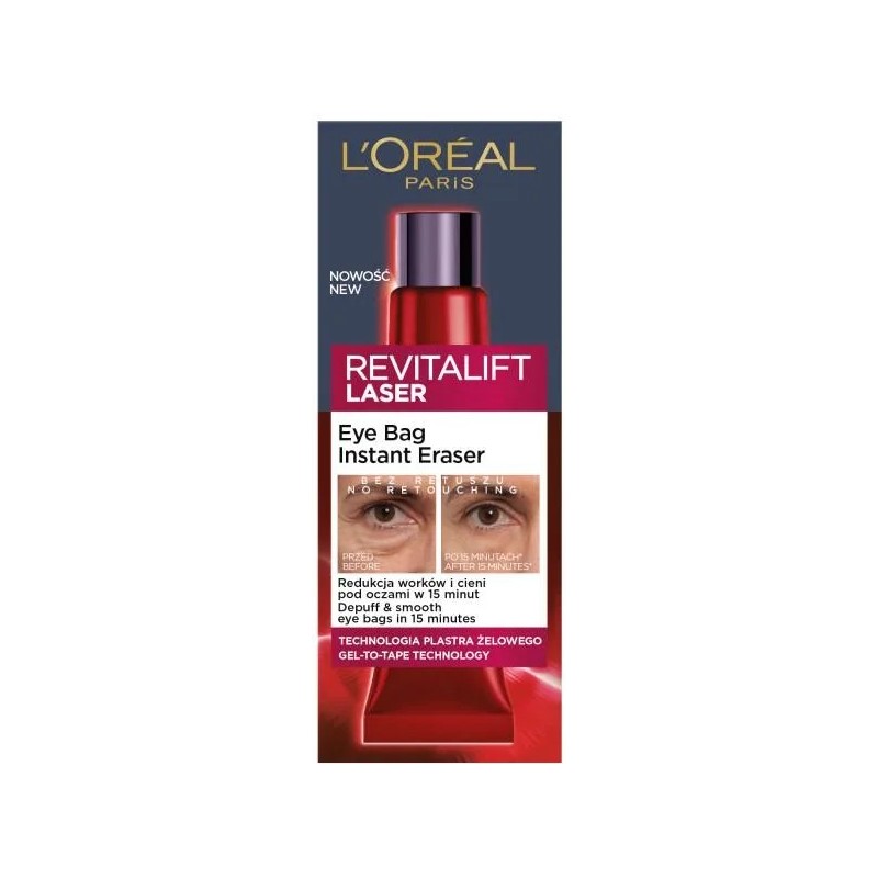 Worki pod oczami, spuchnięte oczy lub zmarszczki pod oczami? W zaledwie 15 minut Revitalift Laser Eye Bag Instant Eraser zapewnia spektakularny efekt napinający, redukujący opuchliznę i wygładzający, aby zmniejszyć nawet bardzo wyraźne worki pod oczami i zmarszczki przez cały dzień. Technologia plastra żelowego tworzy niewidoczną powłokę, odporną na ruchy mimiczne twarzy, zapewniając jednocześnie komfort. Przeznaczony do stosowania w ciągu dnia. Nie należy spać z zaaplikowanym produktem. Stosuj jako ostatni krok w pielęgnacji, na krem lub makijaż. Upewnij się, że skóra jest całkowicie sucha przed nałożeniem. Testowany pod kontrolą okulistyczną. Aby uzyskać pełne instrukcje i ostrzeżenia dotyczące bezpieczeństwa, zapoznaj się z ulotką wewnątrz opakowania.