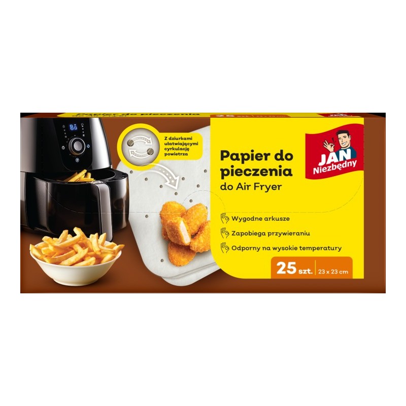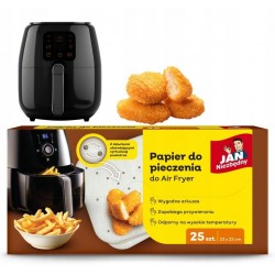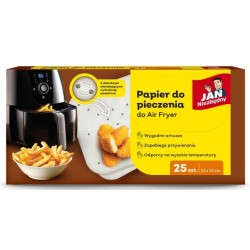 Papier do pieczenia Jan Niezbędny dedykowany do airfryerów to praktyczne rozwiązanie dla miłośników zdrowego gotowania. Zestaw zawiera 25 sztuk perforowanych arkuszy, idealnie dopasowanych do koszyka airfryera, co ułatwia przygotowanie potraw bez przywierania i nadmiaru tłuszczu. Wykonany z wysokiej jakości materiałów, odporny na wysokie temperatury i tłuszcz, zapewnia łatwe czyszczenie urządzenia. Produkt jest biodegradowalny i przyjazny dla środowiska. Idealny do pieczenia, smażenia i grillowania warzyw, mięsa, ryb czy przekąsek.