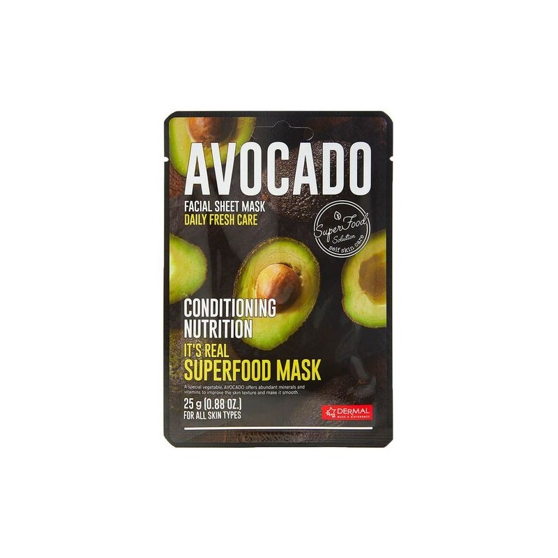oreańska maska w płachcie na twarz z ekstraktem z awokado DERMAL It's Real Superfood Mask Awokado to superfoodowy składnik tej koreańskiej maseczki w płachcie! Skarbnica witamin i przeciwutleniaczy, które dostarczają skórze niezbędnych składników odżywczych. Odnajdziesz tu bogactwo witamin A, C, D i E, które wspomagają nawilżenie skóry, przywracając jej naturalną elastyczność i miękkość. Podczas aplikacji poczujesz delikatny zapach, który przeniesie Cię w świat relaksu i piękna oraz kojący dotyk, podczas gdy gładka płachta doskonale przylgnie do Twojej twarzy, zapewniając głębokie wchłanianie składników odżywczych. Dzięki DERMAL It's Real Superfood Mask Twoja skóra będzie wyglądać zdrowo, promiennie i młodo! Zapewnij spokój swojej skórze! DERMAL It's Real Superfood Mask Koreańska maseczka w płachcie zawiera m.in.: ekstrakt z awokado – pomaga w wygładzaniu skóry i redukcji drobnych linii i zmarszczek, wspiera procesy regeneracji skóry, naprawia uszkodzenia spowodowane przez czynniki środowiskowe i promieniowanie UV, posiada właściwości łagodzące i przeciwzapalne, może pomóc w redukcji zaczerwienień, podrażnień i swędzenia skóry. Działa również kojąco na skórę, łagodząc objawy podrażnień i uczucie napięcia. kwas hialuronowy – wypełnia zmarszczki. Wiąże wodę w naskórku, dzięki czemu zapobiega jej utracie. Nawilża, odmładza, wzmacnia i poprawia elastyczność skóry. Ma również działanie regenerujące, przyspiesza gojenie ran, działa przeciwzapalnie, likwiduje blizny i przebarwienia, wzmacnia barierę ochronną skóry.