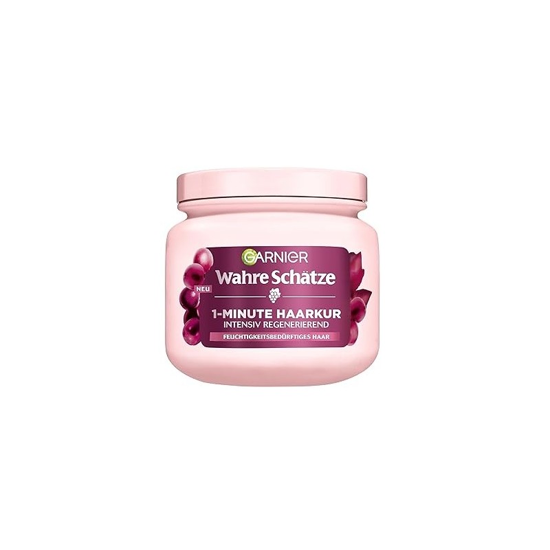 Włosy potrzebujące nawilżenia otrzymują intensywnie regenerującą pielęgnację dzięki 1-Minute Hair Treatment od Garnier Wahre Schätze. Kremowa, rozpływająca się maska charakteryzuje się formułą wody winogronowej i olejku z pestek winogron, które intensywnie nawilżają, regenerują blask i chronią włosy przed codziennymi obciążeniami, takimi jak szczotkowanie, stylizacja na gorąco i promieniowanie UV. Jednocześnie delikatny owocowo-kwiatowy zapach neroli, różowych winogron i aksamitnego piżma uwodzi zmysły, a włosy są nawilżone do czterech dni i otrzymują natychmiastowy blask i wzmocnienie.