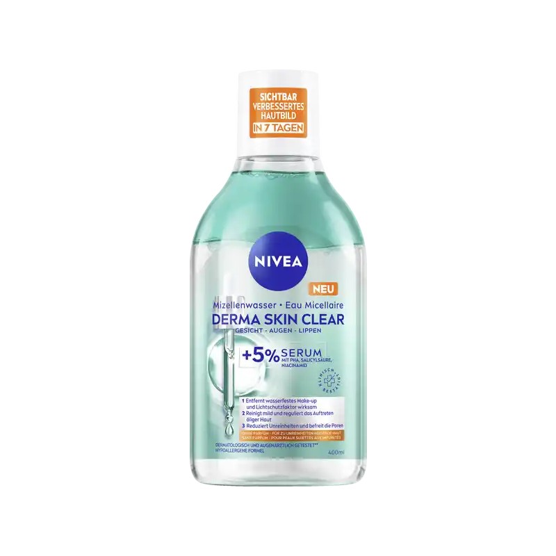 NIVEA Derma Skin Clear płyn micelarny z 5% serum to innowacyjne rozwiązanie w codziennej pielęgnacji cery skłonnej do niedoskonałości. Dzięki zaawansowanej formule łączącej PHA, kwas salicylowy, niacynamid oraz kompleks aminokwasów, płyn skutecznie usuwa nawet wodoodporny makijaż i filtry SPF, jednocześnie łagodnie oczyszczając skórę twarzy, oczu i ust.
