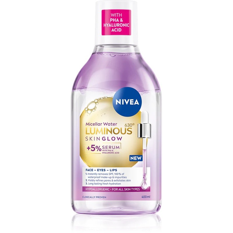 Woda micelarna NIVEA Luminous Skin Glow wzbogacona została o małe cząsteczki aktywne, które wiążą wszelkie zanieczyszczenia i sebum w kontakcie ze skórą. Zawartość tych drobnych cząsteczek zwanych micelami gwarantuje dokładny demakijaż w niespełna kilka minut, bez konieczności naciskania lub tarcia skóry. Micele są na tyle skuteczne, by uporać się nawet z wodoodpornym makijażem.