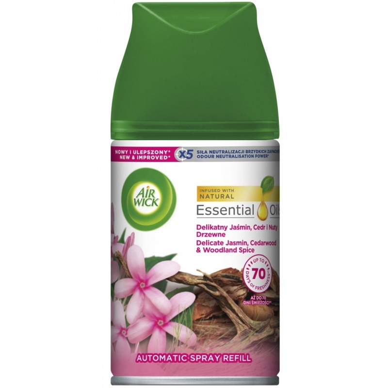 Air Wick Freshmatic Delikatny Jaśmin, Cedr i Nuty Drzewne to oryginalny wkład do automatycznego odświeżacza powietrza , który wypełnia wnętrze kwiatowo-drzewnym aromatem inspirowanym naturą. Zapach róży, jaśminu i goździków łączy się z głębią wetiweru, drzewa sandałowego, paczuli i cedru, tworząc zmysłową i wyrafinowaną kompozycję . Produkt należy do ekskluzywnej linii Essential Oils , opartej na naturalnych olejkach eterycznych, które nadają wnętrzu charakter i przytulność.