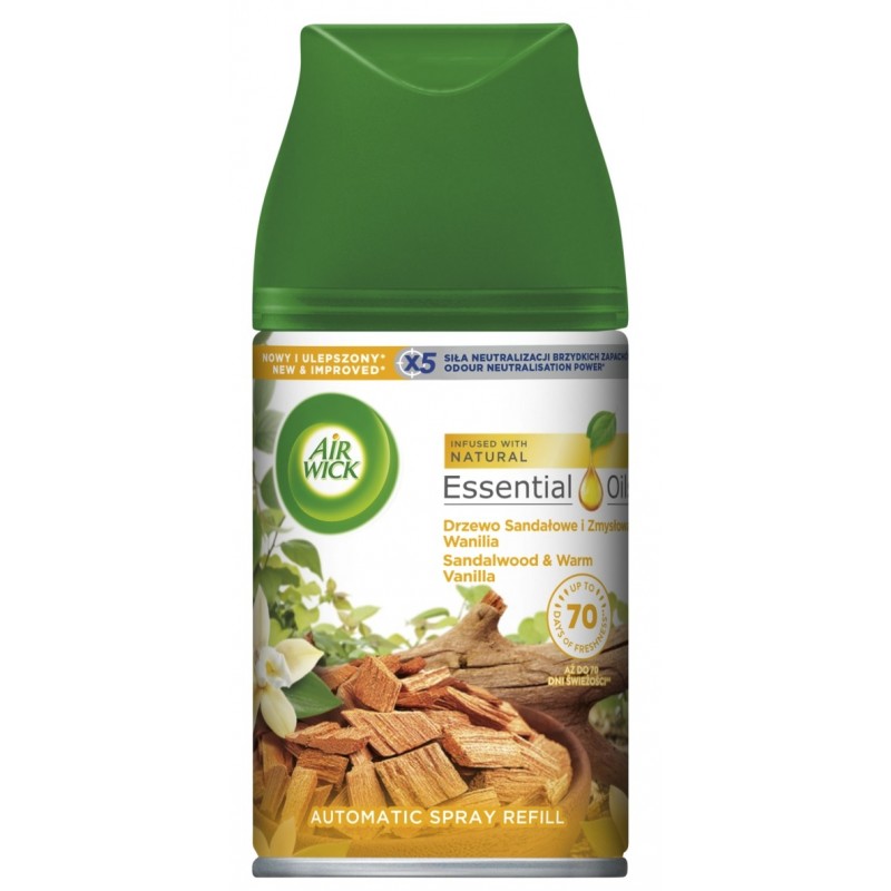 Odświeżacz powietrza Air Wick Freshmatic Vanilla & Sandalwood rozprzestrzeni zapach w Twoim domu i stworzy przyjemną atmosferę. Neutralizuje nieprzyjemne zapachy i przynosi natychmiastową pomoc w walce z niepożądanymi zapachami w Twoim domu.