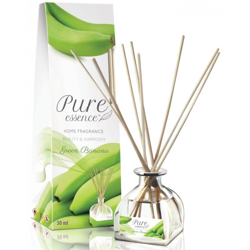 Aromat zielonych bananów to zestawienie rozkosznej słodyczy z apetyczną beztroską dzieciństwa. Zielone banany to nuta trwała, ale i charakterna - nie pozostawia ludzi niezdecydowanych - albo, ktoś jest jej miłośnikiem, albo nie. Aromat ten hamuje łaknienie, odpręża i sprawia, że człowiek zaczyna odczuwać wewnętrzny spokój.Dyfuzor Pure Essence to połączenie elegancji i nowoczesności zamknięte w pięknym dyfuzorze z patyczkami. Ten dekoracyjny flakonik uwalnia nieziemski zapach przez kilka tygodni. Co kilka dni należy odwrócić patyczki (część zamoczona w olejku powinna być nad flakonikiem), dzięki temu zwiększy się intensywność uwalnianej woni.