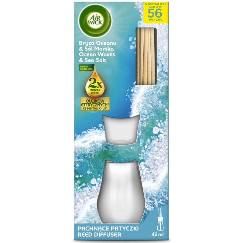 Dyfuzor zapachowy Bryza Oceanu & Sól Morska to świeża kompozycja inspirowana zapachem morskiej bryzy i soli, wzbogacona nutami cytrusów, cedru, bursztynu i ciepłego drewna.