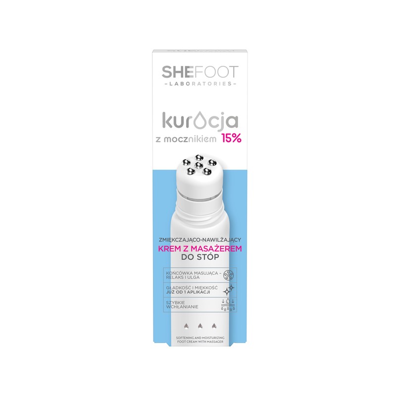 Dermokosmetyczny KREM o stężeniu 15 % mocznika, zamknięty w tubie zakończonej nowoczesną końcówką masującą. Wygodny w aplikacji oraz skuteczny w stosowaniu, w przyjemny sposób przywraca skórze stóp i pięt odczuwalną gładkość oraz miękkość. Kompozycja składników aktywnych odczuwalnie poprawia wygląd i kondycję stóp JUŻ PO 1 APLIKACJI, a nowoczesna końcówka masująca poprawia komfort stosowania, wspomaga efektywne wmasowanie kremu w naskórek, przynosi ulgę także zmęczonym kostkom i łydkom już w trakcie aplikacji.