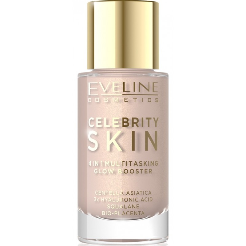 Eveline Cosmetics Celebrity Skin 4in1 Multitasking Glow Booster to innowacyjna, wielofunkcyjna baza do twarzy, która w jednej lekkiej formule łączy właściwości bazy pod makijaż, skin tintu, rozświetlacza i filtra soft-focus. Formuła natychmiast wyrównuje koloryt, wygładza i rozświetla cerę, nadając jej naturalny, promienny wygląd bez efektu maski, zapewniając efekt glow idealny solo lub jako baza pod podkład.