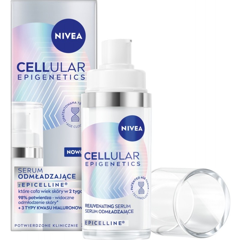 Skuteczne serum, które sprawia, że skóra jest bardziej promienna, wypełniona i wygląda młodziej. Serum zawiera przełomowy składnik Epicelline®, odkryty przez NIVEA w dziedzinie epigenetyki, który reaktywuje młodzieńcze funkcje komórek. Dzięki opatentowanej technologii Age Clock, Epicelline® cofa wiek skóry w 2 tygodnie. Połączenie 3 rodzajów kwasu hialuronowego wzmacnia działanie serum, zapewniając intensywne nawilżenie i efekty anti-aging.