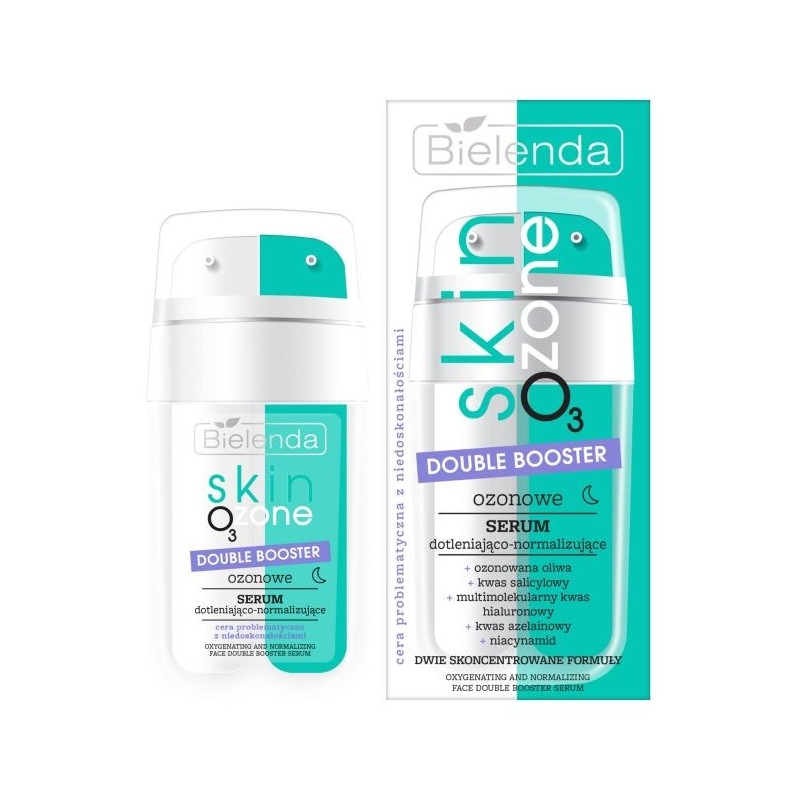 Double booster ozonowe serum dotleniająco-normalizujące, 2x7,5 ml z linii Bielenda SKIN O3 ZONE dla cery problematycznej z niedoskonałościami. Serum jest przeznaczonoe na noc, dedykowane cerze problematycznej z niedoskonałościami. Aktywna, podwójna kremowo-żelowa formuła normalizująca, wygładza, zmiękcza, redukuje niedoskonałości, zwęża pory i przywraca skórze równowagę.