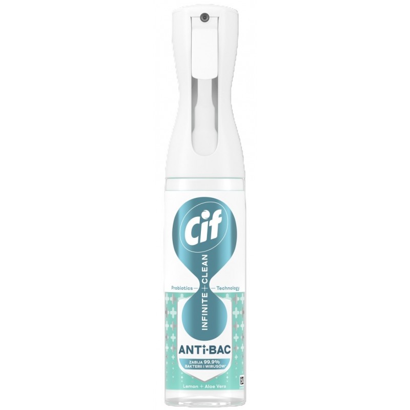 Cif Infinite Clean Anti-Bac Lemon & Aloe Vera Antybakteryjny Spray – Odkryj nowy wymiar czystości – skuteczna ochrona przed bakteriami i wirusami połączona z przyjemnym zapachem.