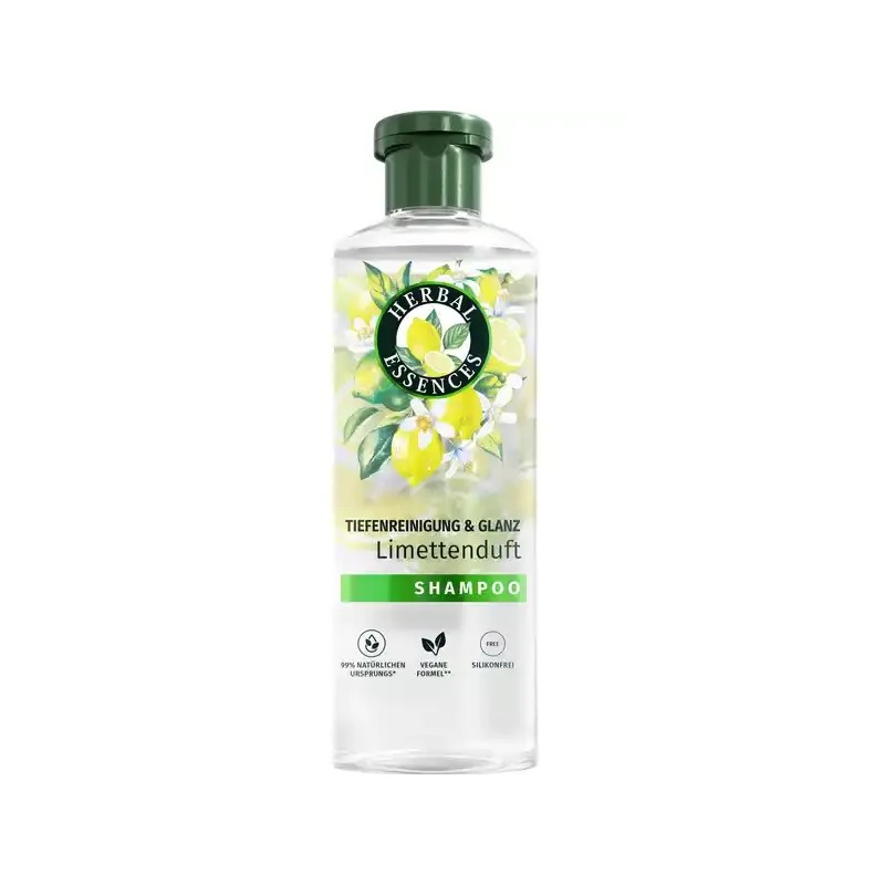 Szampon Herbal Essences Deep Cleanse & Shine o zapachu limonki dokładnie oczyszcza włosy i usuwa zanieczyszczenia. Formuła bez silikonu pozostawia włosy lekkie, czyste i lśniące. Wzbogacony świeżym zapachem limonki, szampon pobudza zmysły i zapewnia uczucie energii. Wegańska formuła, zawierająca 99% składników pochodzenia naturalnego*, oczyszcza i odświeża zarówno włosy, jak i umysł. *dotyczy składników zawartych w formule.