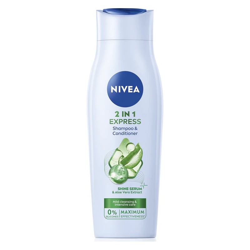 Łagodny szampon pielęgnujący NIVEA® 2w1 Care Express z ekstraktem z Aloe Vera . Ulepszone formuły sprawiają, że szampon idealnie dostosowuje się do naturalnego poziomu pH Twojej skóry. Delikatnie oczyszcza skórę głowy i pielęgnuje włosy nie obciążając ich. Wzmacnia włosy i nadaje im zauważalną objętość, a jednocześnie chroni włosy ułatwiając ich rozczesywanie. Dla pięknych włosów i zdrowej skóry głowy.