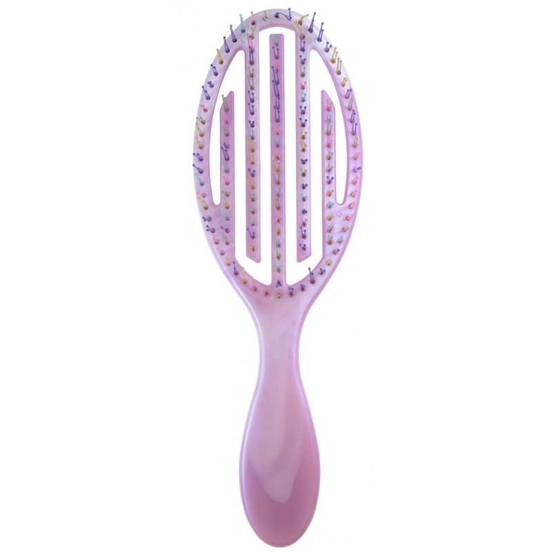 Perłowa szczotka z dwoma długościami nylonowych szpilek zakończonych kulkami ułatwia rozczesywanie nawet najbardziej splątanych włosów, a przelotowa konstrukcja przyspiesza suszenie i modelowanie fryzury.