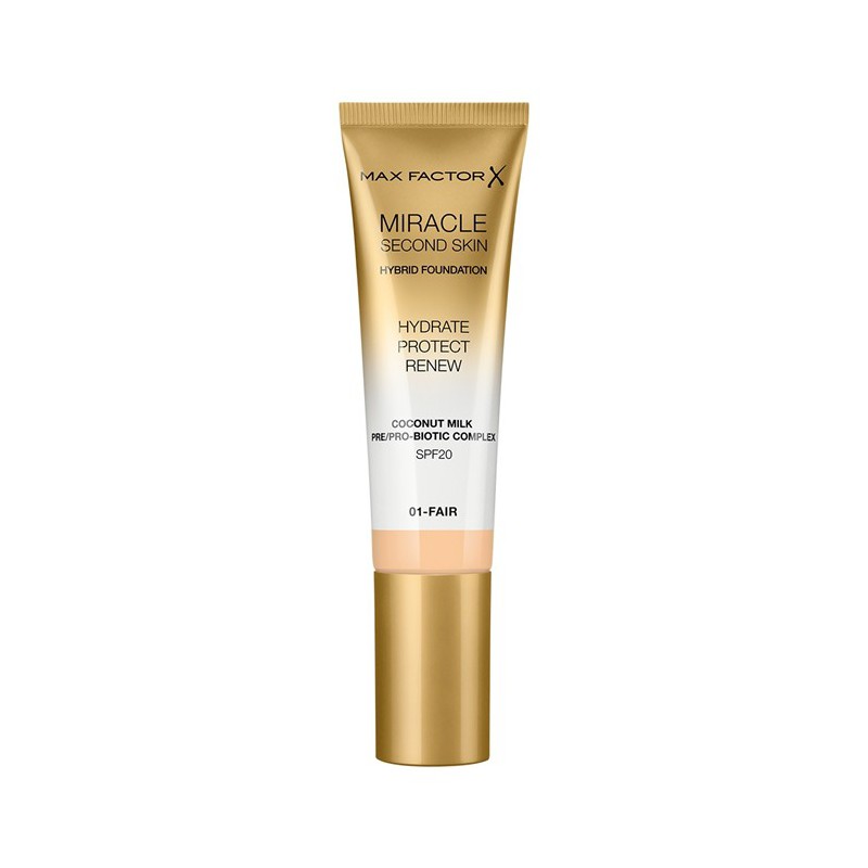 MAX FACTOR MIRACLE SECOND SKIN Podkład nawilżający SPF20 - 01 FAIR Wyjątkowe połączenie lekkiego płynnego podkładu oraz właściwości kryjących podkładów w kompakcie. W składzie znajduje się mleczko kokosowe pochodzenia naturalnego, które zapewnia nawilżenie skóry, sprawia że staje się ona miękka i promienna. Formuła została wzbogacona o prebiotyki oraz priobotyki.