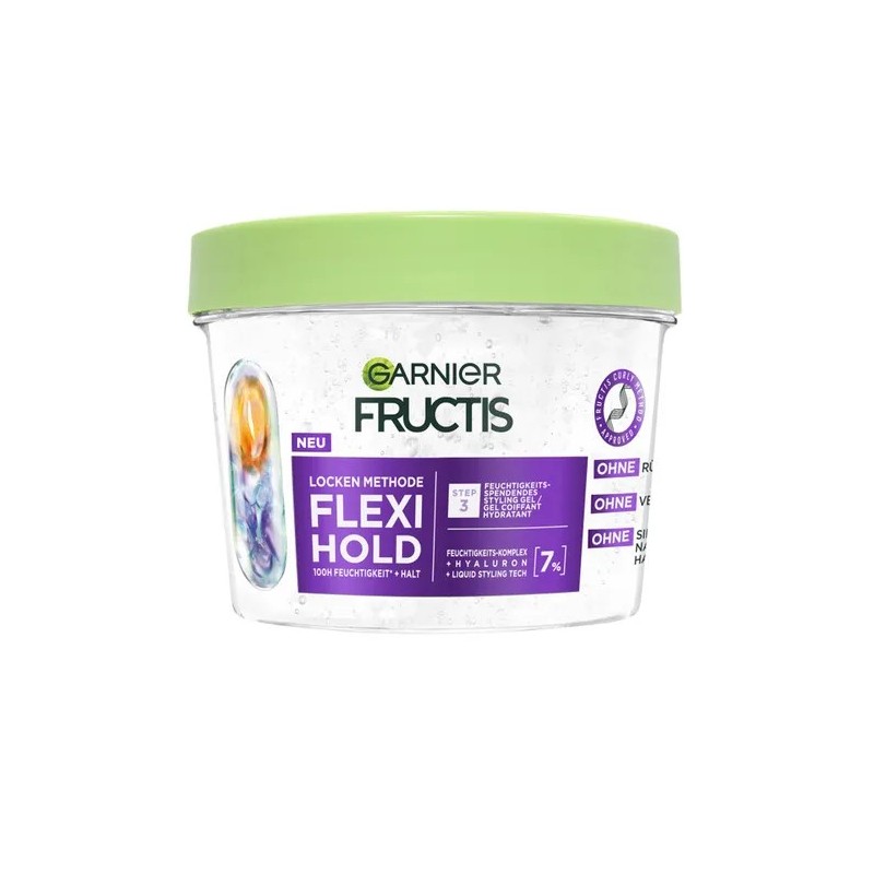 Curl Method Flexi Hold to nawilżający żel z gamy Curl Method marki Garnier Fructis. Został opracowany specjalnie dla wszystkich rodzajów i długości loków, aby nawilżać je i podkreślać nawet do 100 godzin oraz zapewniać im długotrwałe i elastyczne utrwalenie. Jednocześnie 7% kompleks nawilżający z kwasem hialuronowym i płynną technologią stylizacji zapewnia do 100 godzin odporności na wilgoć i jest odporny na poduszki. Formuła nie zawiera silikonów, nie pozostawia osadu ani tłustego uczucia i nie skleja włosów, zapewniając im komfort i naturalność.