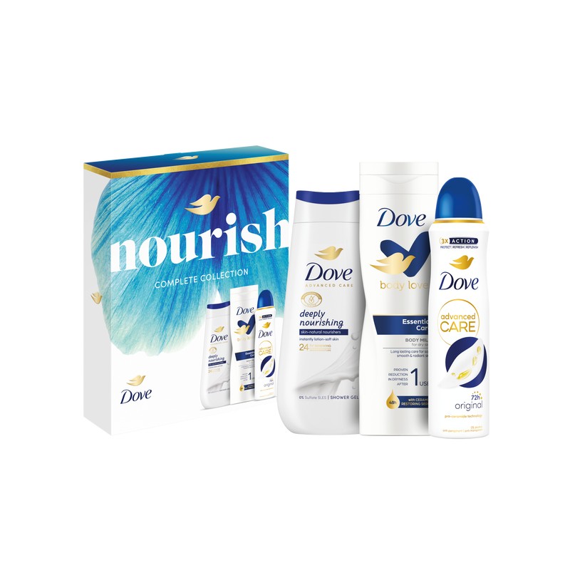 DOVE KOMPLET WOMEN ŻEL 250 DEEPLY+DEZODORANT 150 ORIGINAL+MLECZKO 250 ESSENTIAL