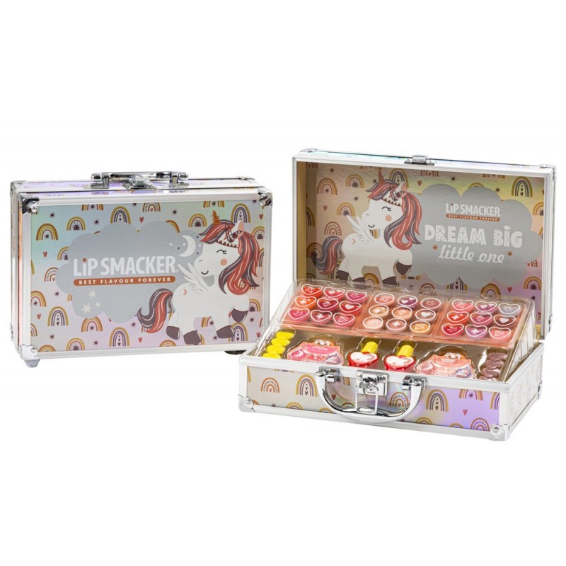 Całość zapakowana w kolorową walizkę z jednorożcem, co czyni go gotowym do wręczenia jako prezent.