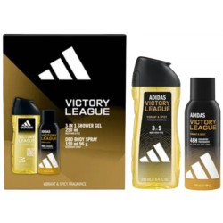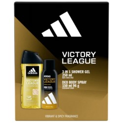 Adidas Victory League to elegancki zapach dla pewnego siebie mężczyzny, który wierzy w indywidualne osiągnięcia, a jednocześnie wie, że praca zespołowa prowadzi do zwycięstwa. Świeżość aromatycznych nut głowy z bergamotki, bazylii i świeżo skoszonej trawy wywodzi się z owocowo-korzennego serca zapachu z nutami lawendy, gruszki i cynamonu. Wyjątkowy charakter tego eleganckiego zapachu podkreślają zmysłowe i męskie akcenty drewna cedrowego, wanilii i piżma. Opakowanie zawiera 150 ml dezodorantu do ciała i 250 ml żelu pod prysznic.